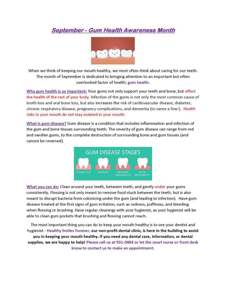 Our non-profit dental clinic, Healthy Smiles Forever, is here in the building to assist you in keeping your mouth healthy.  If you need any dental care, information or dental supplies we are happy to help.  Please call us at 931-0484 or let the court nurse or front desk know to contact us to make an appointment